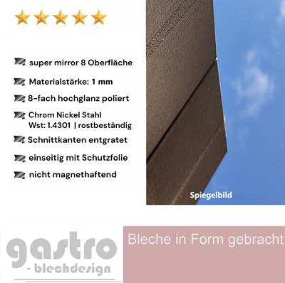 » » » Edelstahl Blech hochglanz poliert, super mirror8, 1mm Blechspiegel, Spiegelblech